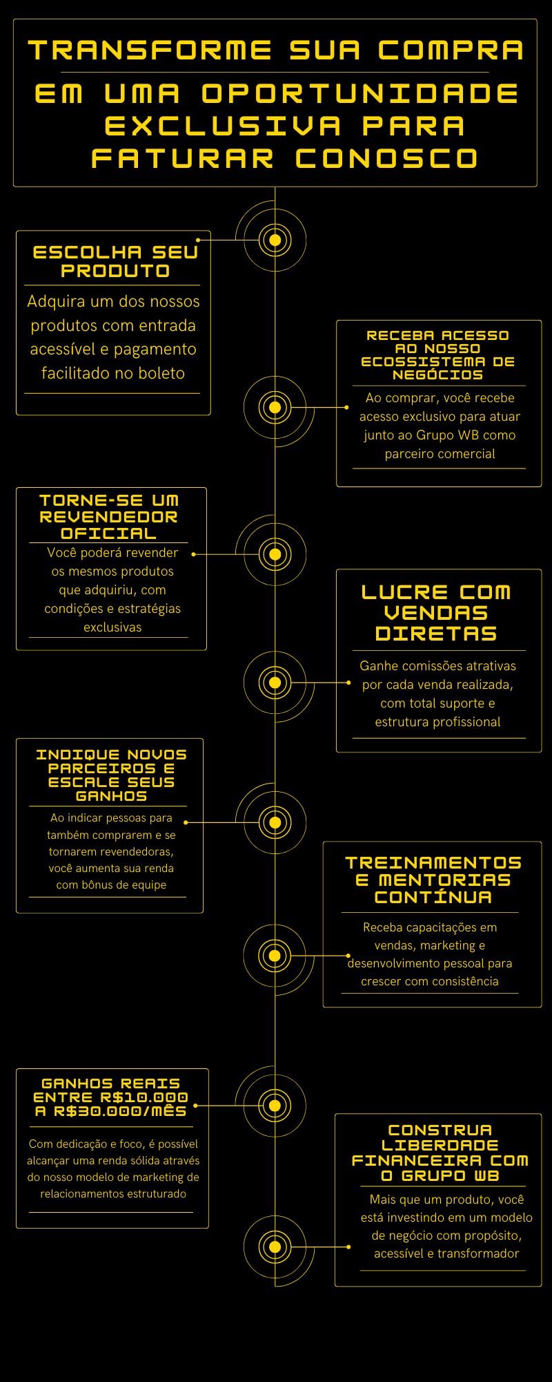 Composta por 8 empresas, o grupo atua em diferentes setores como: Braço Educacional, Venda de iPhones, Veículos e Imóveis, etc... oferecendo condições facilitadas e acessíveis para tornar sonhos possíveis. Com uma gestão focada em pessoas e propósito, o Grupo WB já ultrapassou os R$ 2 milhões em faturamento e segue transformando vidas por meio de oportunidades reais e descomplicadas.